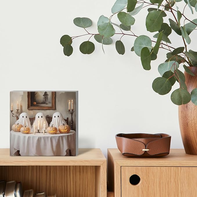 Mtrgdn Cute Halloween Decor,Halloween Decorations Indoor,Ghost with Pumpkin Desk Decor Wooden Box Sign,Halloween Home Office Kitchen Bathroom Bedroom Coffee Bar Table Shelf Wall Decorations,5x5 Inch