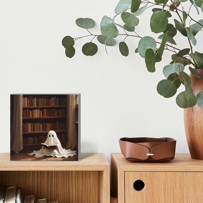 Mtrgdn Cute Halloween Decor,Halloween Decorations Indoor,Ghost Reading Desk Decor Wooden Box Sign,Halloween Home Office Kitchen Bathroom Bedroom Coffee Bar Table Shelf Wall Decorations,5x5 Inch