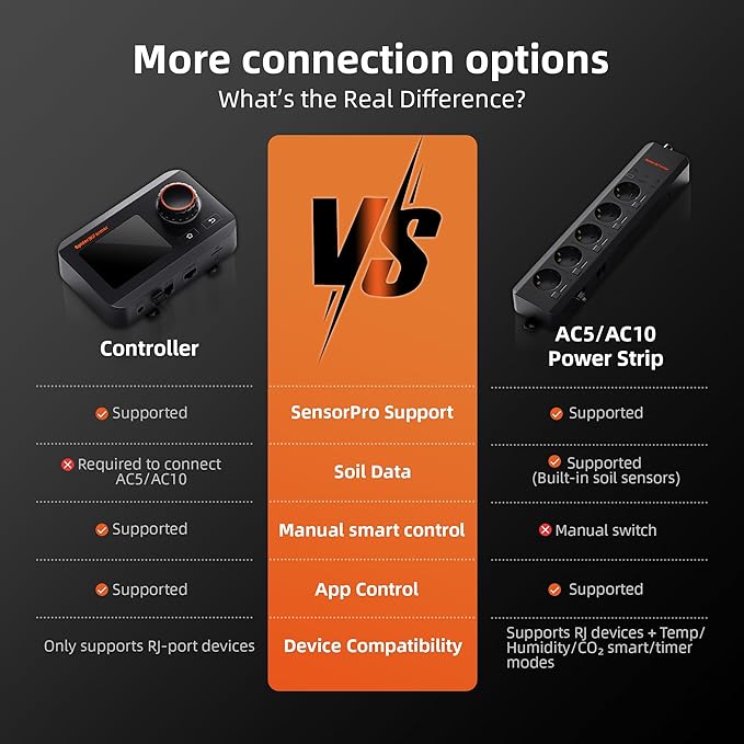 - 4-in-1 Sensor: The SF Sensor Pro integrates four key measurements(temperature, humidity, PPFD, VPD) into a single device. Real-time monitoring of multiple critical parameters within the growing environment, helping users optimize the microclimate for enhanced plant growth.Note: When using SensorPro, make sure to disconnect the original temperature and humidity sensor from the controller or power socket to ensure only one sensor is providing readings.
