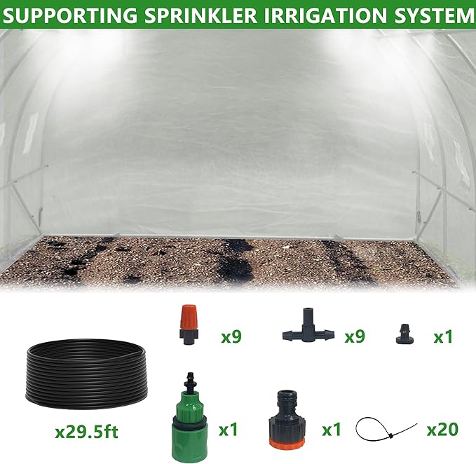 - 【Watering System】Our greenhouse kit is equipped with a sprinkler system, 29.5ft long pipeline, 4/7mm hairpipe sprinkler set, maximum working water pressure of 8kgs, can meet your daily watering needs, just access to the water source, free your hands, no need to manually spray a little bit, so you can easily enjoy the planting time.