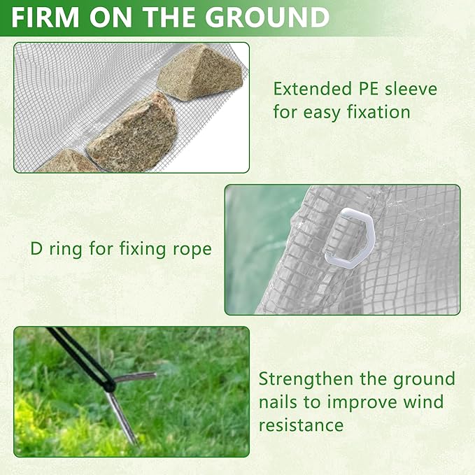 - 【Firmly Fixed】With an extra-long PE cover that can be pressed or buried in the soil, this greenhouse is built for strength. Coupled with windproof ropes and ground spike reinforcement, it provides superior stability even in high winds. This outdoor greenhouse remains firmly in place, protecting your plants from harsh gusts, ensuring your garden stays intact and thriving, no matter how fierce the storm.