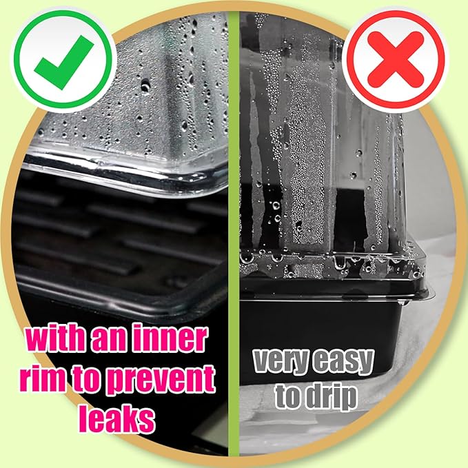 - 【4'' Drip-proof Dome】Say goodbye to messy condensation! Our dome is expertly designed to channel water back into the seed tray, so you’ll never have to deal with leaks or spills. The tall, transparent dome provides ample space for seedlings to thrive for weeks, while the adjustable air vents allow you to control airflow effortlessly. Plus, the clear design ensures maximum light penetration and a clear view of your growing plants.