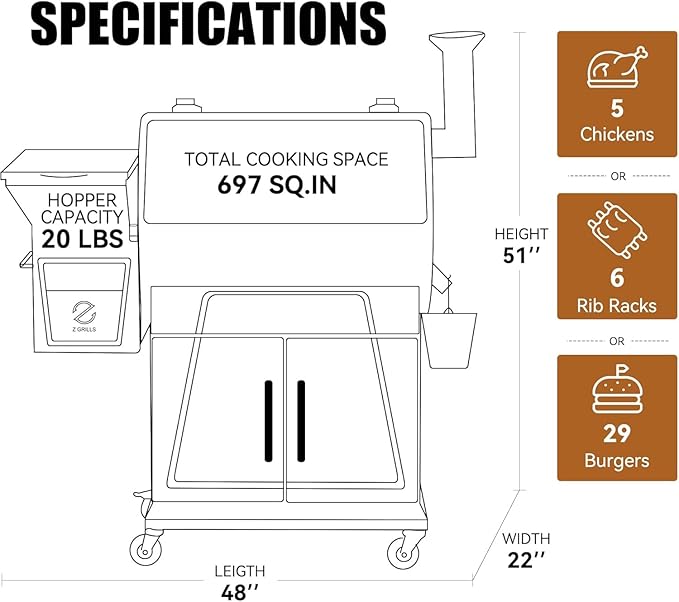 - AMPLE COOKING SPACE FOR FAMILY FEASTS - With 697 sq. in. of cooking area, the 700D6 easily handles large meals β accommodating up to 29 burgers, 6 racks of ribs, or 5 whole chickens. Two integrated meat probes allow real-time monitoring of different dishes simultaneously.
