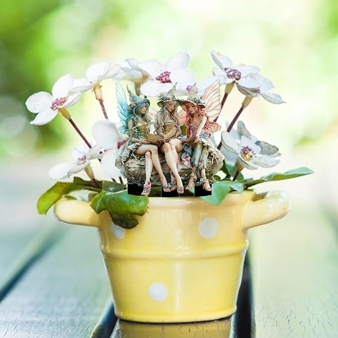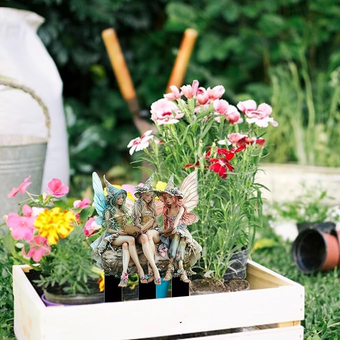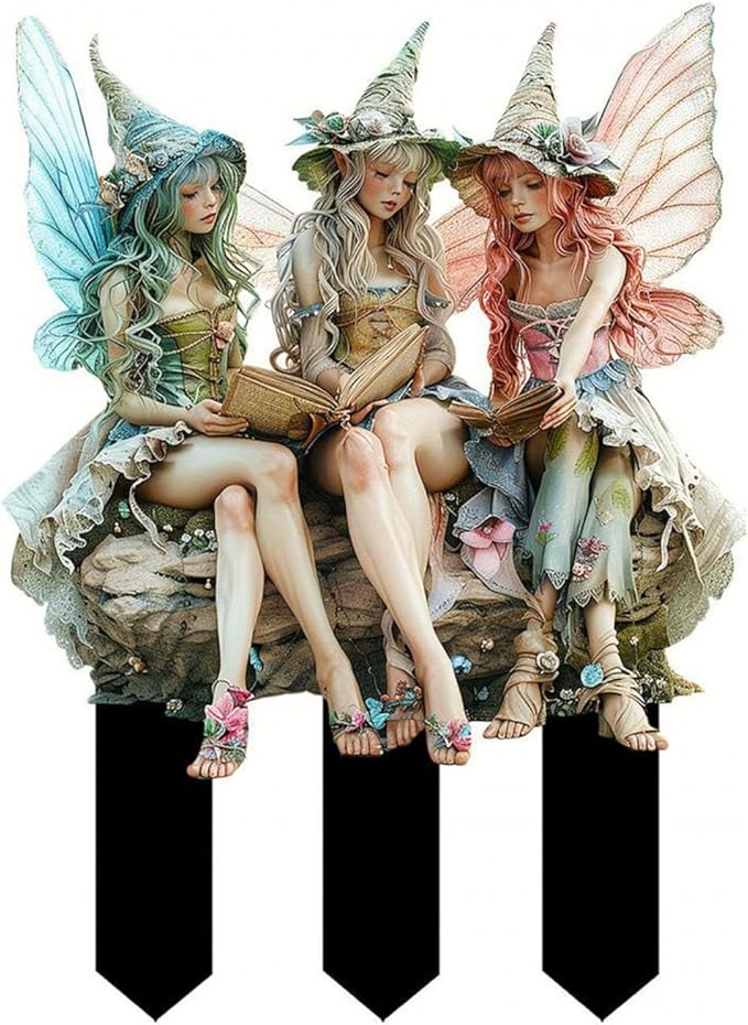 Fairy Garden Stake Decor, 2D Flat Acrylic Fairy Garden Decor Panel, Elf Yard Sign for Outdoor Indoor Yard Lawn Plants Pots, Fairy Yard Accessories (Three Fairies)