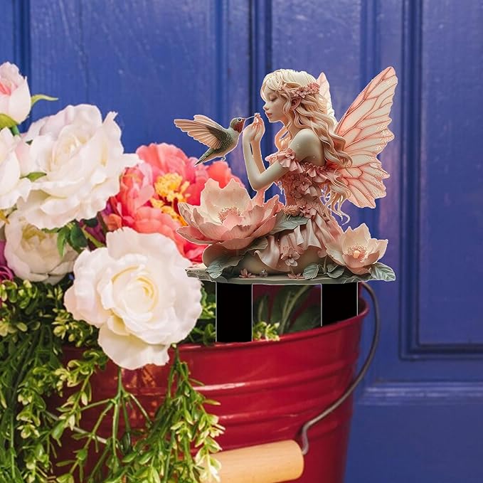 Fairy Garden Stake Decor, 2D Flat Acrylic Fairy Garden Decor Panel, Elf Yard Sign for Outdoor Indoor Yard Lawn Plants Pots, Fairy Yard Accessories (Fairy and Hummingbird)