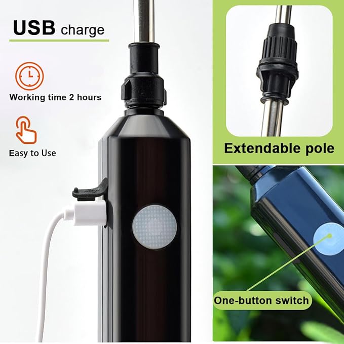 - 【Efficient Gardening】Say goodbye for manual pump sprayer that make our hands sore, use new electric pump sprayer, simply press a button for spraying automatically. The handle has a built-in 2200mAh battery with 3-hour spraying time per Type-c USB charged