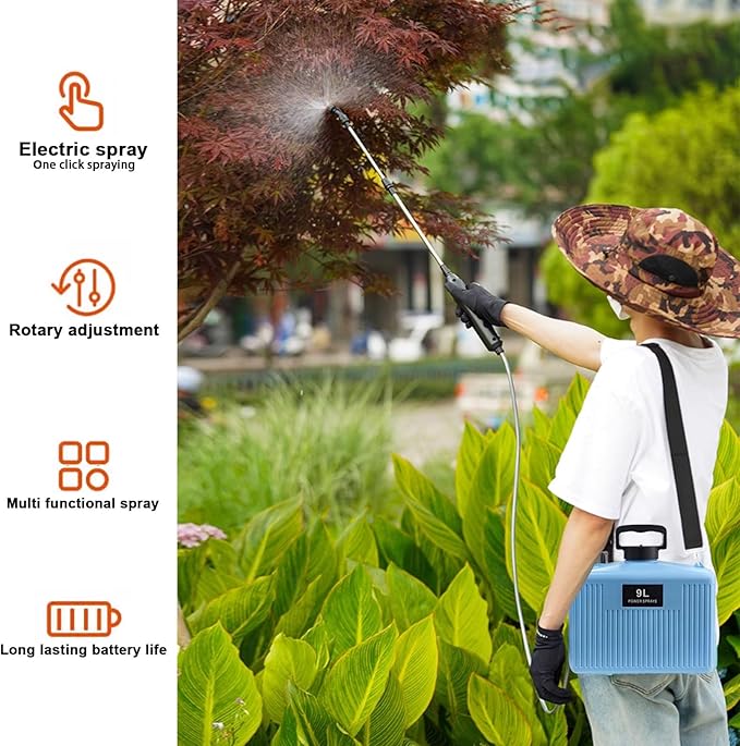 - 【Reasonable Design】Packing include 2pcs electric sprayer, one is 2.4 gallon battery operated sprayer for garden use and 0.5 gallon automatic sprayer indoor use.