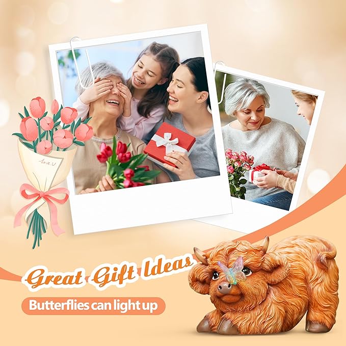 Highland Cow Solar Powered Outdoor Garden Statue, Resin Highland Cow Statue with Solar Light Lantern, Decorative Lawn, Yard Outdoor Highland Cow Decor. Unique Home Decorations, Gifts for Women