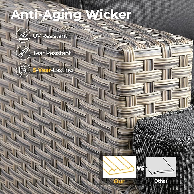 - All Weather & Durable: Selected anti-ageing treated thicken PE wicker rattan for UV resistant, wear resistant and all weatherproof. 3D strengthen and widen design for extended service life,twice service life as others