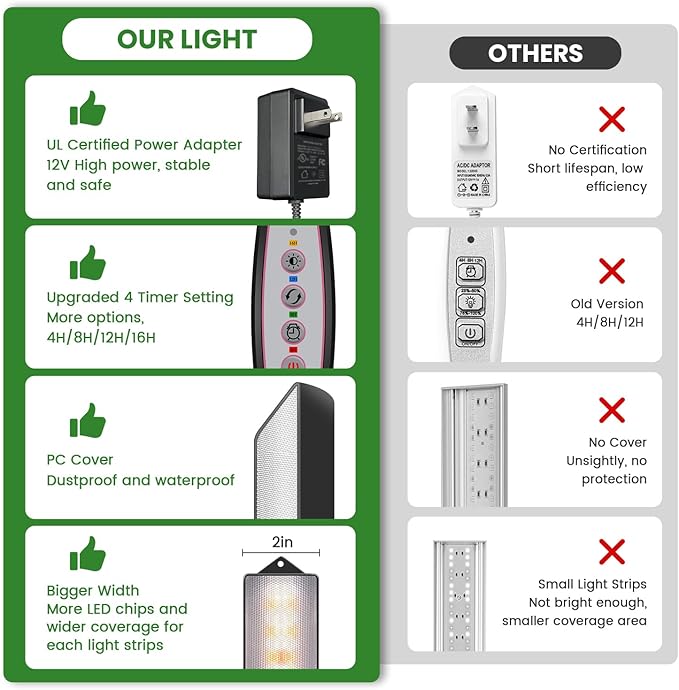 - New Design: The 2-inch-wide grow light bar provides broad illumination, covering more plants. The curved housing minimizes light loss and improves lighting efficiency. The PC cover prevents dust and water mist from sticking to the LEDs, extending the lifespan and making cleaning easy.