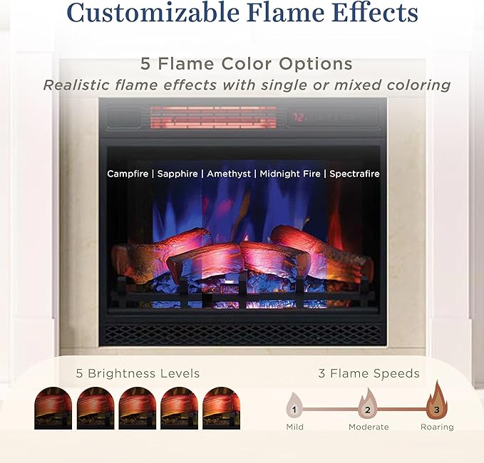 - Special Feature : 23" Electric Firebox, Adjustable Flame, Corded, Multi-Flame Options, Realistic Log Set