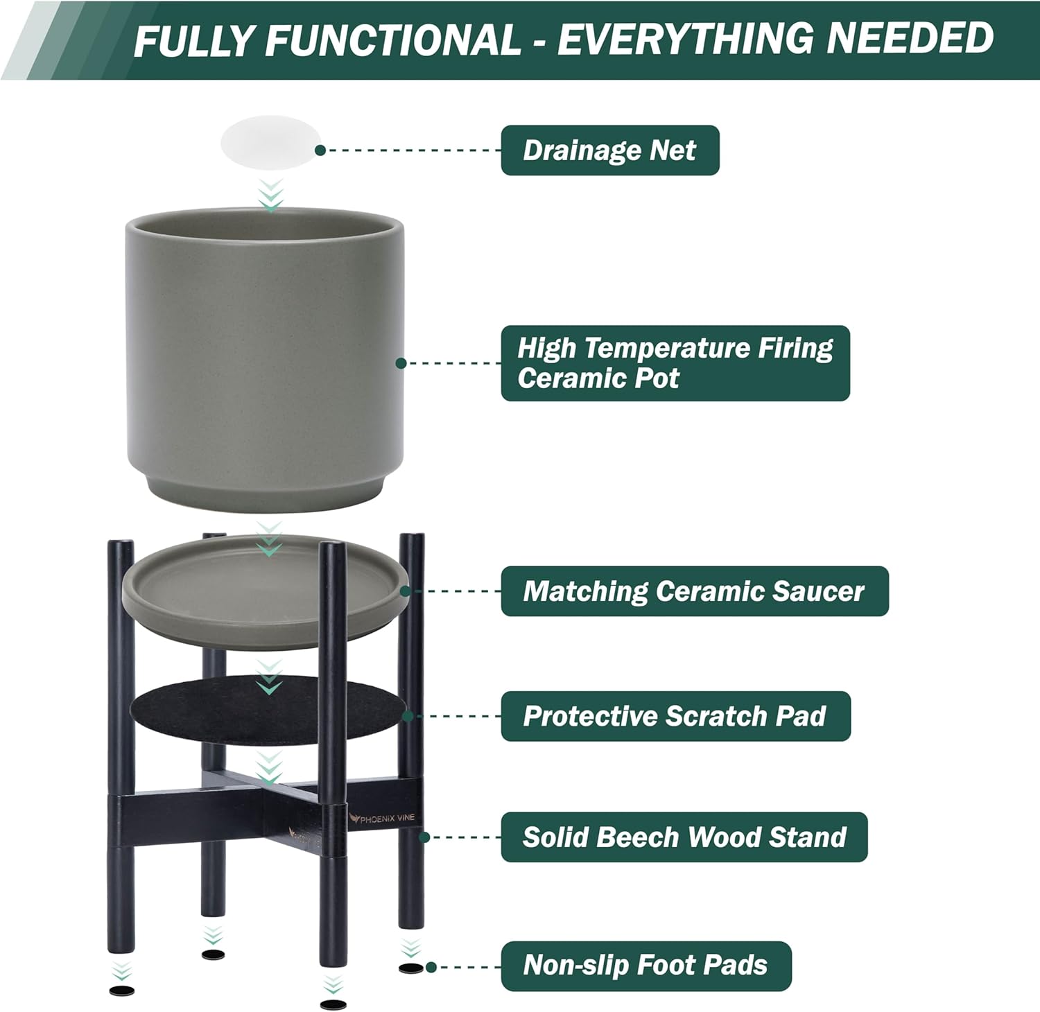 - A Complete Set: Mid-century ceramic planter, combined with a ebony wood stand that match perfectly together and looks great in anywhere.