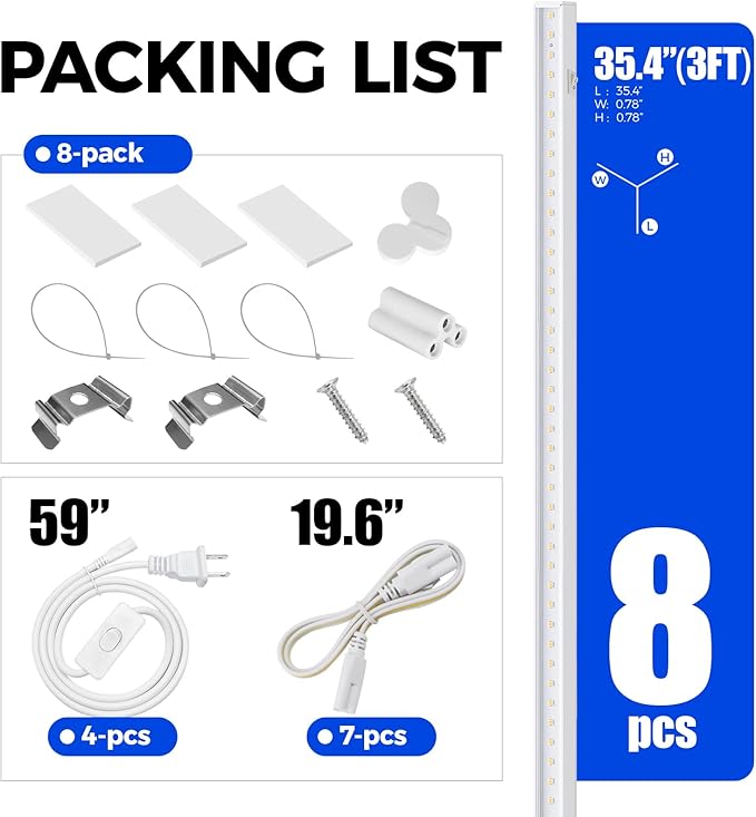 - What You Get: 8 x Barrina T5 Grow Lights, 4 x Power Cords with ON/OFF Switch, 7 x Connecting Cords (20''), 8 x Small Connectors, 16 x Installation Clips, 16 x Double-sided Tapes, 24 x Cable Ties, 8 x Dustproof Cap