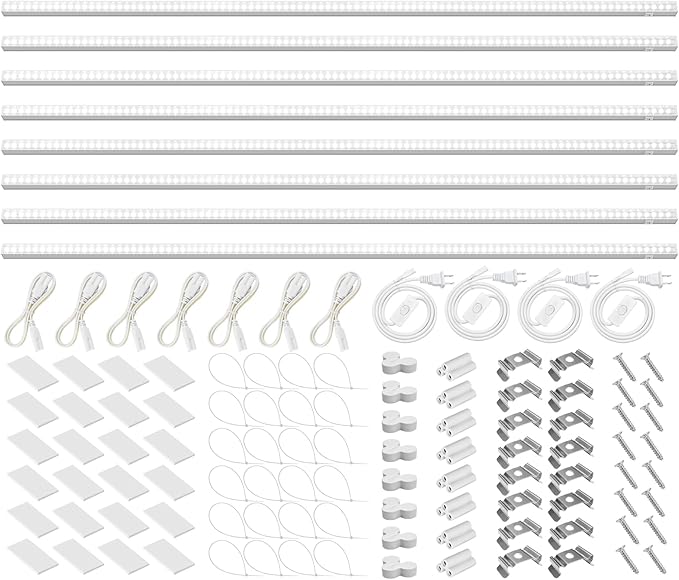- What You Get: 8 x Barrina T5 Grow Lights, 4 x Power Cords with ON/OFF Switch, 7 x Connecting Cords (47.2''), 8 x Small Connectors, 16 x Installation Clips, 16 x Double-sided Tapes, 24 x Cable Ties, 8 x Dustproof Cap