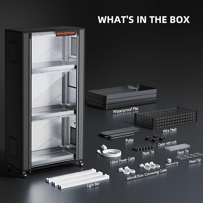 - What You Get: 6 X 24" Grow Lights, 3 X 13.8" Connecting Cords, 2 X 23.6" Connecting Cords, 1 X 59" Power Cable, 4 X Wire Mesh, 8 X 23.6" Support Pole, 4 X 11.8" Support Pole, X 4 X Caster with Lock, 1X Semi-Transparent Tent, 3 X Waterproof Mat, 36X Plastic Clip, 12 X Metal Clip, 16 X Plastic Tie, 1X Waterproof Cap, 1X User Manual, 2 Years Support Services