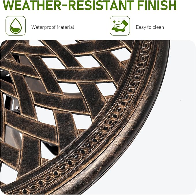 - PREMIUM CAST ALUMINUM: Crafted from high-quality cast aluminum, this round bistro table is built to withstand the elements. With exceptional durability, weather resistance and rust-proof features, it ensures long-lasting outdoor enjoyment with minimal maintenance required