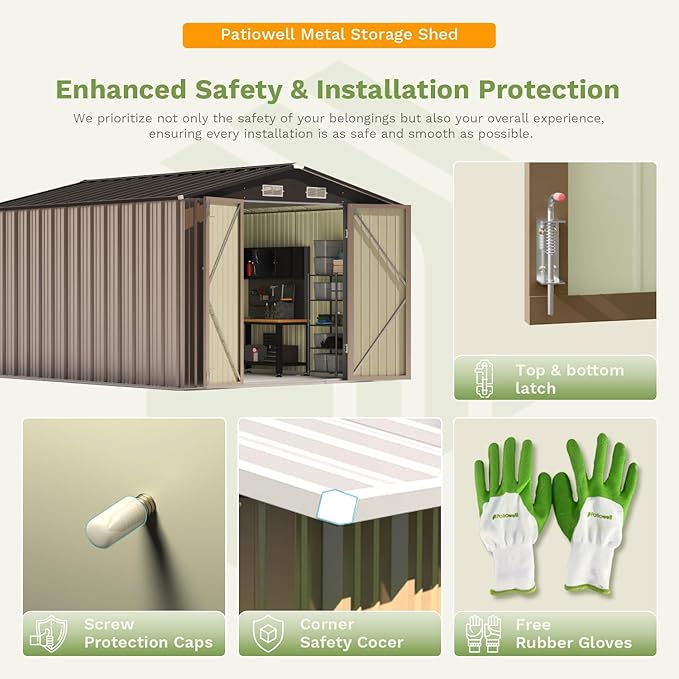Patiowell 10 x 12 FT Metal Storage Shed for Outdoor with Floor Frame, Steel Yard Shed with Design of Lockable Doors, Utility and Tool Storage for Garden, Backyard, Patio, Outside use,Brown