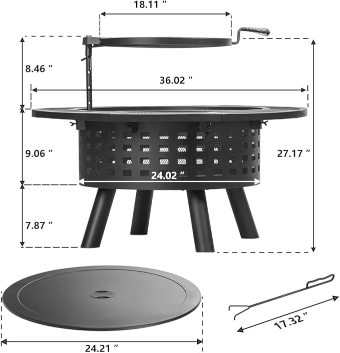 - 🔥【Beautiful & Humanized Design】The Verdeluxe wood fire pit is equipped with a height adjustable 360 ° rotating grill that can be freely disassembled.There is a circle of table panels next to the fire pit bowl.It can conveniently store cutlery and food.The cooking grill has four levels of height adjustment, which allows food to be cooked under appropriate heat and enjoy the delicious barbecue experience.