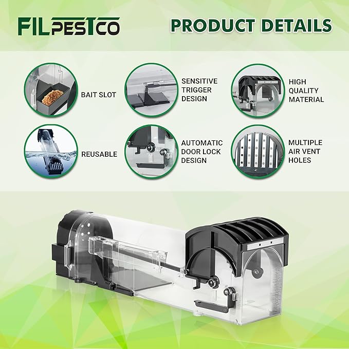 - Sensitive Trigger Mechanism - Our trap is designed to catch mice and medium size rat. Consists of sensitive trigger mechanism that even a mice that weigh 8 grams can activate the trap and closes the front door for no escape trapping.
