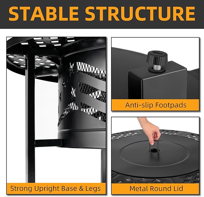 - 【Heavy Duty & Stable】Crafted from high-quality metal steel and finished with a high-temperature powder coating, this outdoor firepit with 2 grills delivers exceptional resistance to heat, water, rust, and scratches, ensuring long-lasting durability. The 4 upright metal legs are fitted with rubber footpads for a stable base and prevent the patio fire pit from accidentally moving during use.