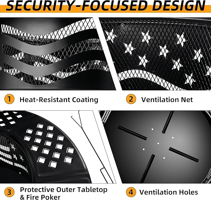- 【Safe Design】The firepit for outside is designed with a mesh sidewall and has 4 ventilation holes at the base of the fire bowl to sustain strong airflow and flames while effectively containing sparks and embers. The included poker helps you remove wood and charcoal safely away from the metal fire pit, enhancing secure handling during use.