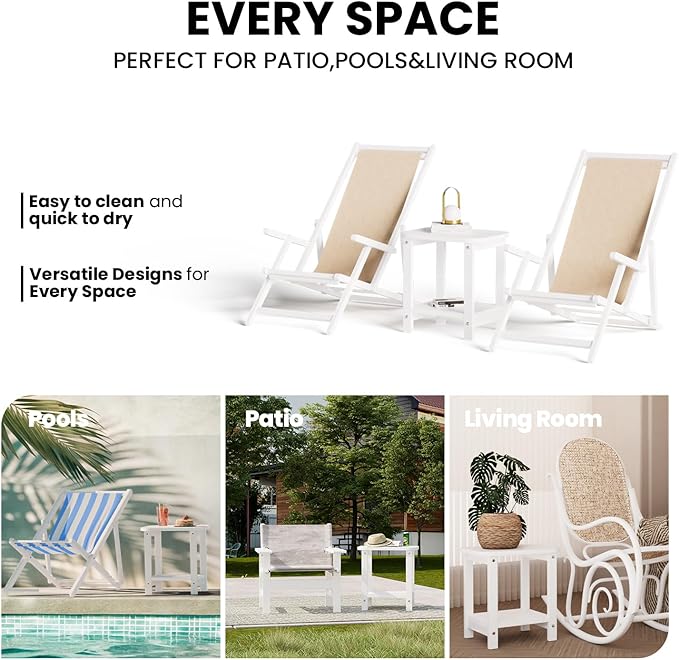 - 【HDPE Material】Outdoor side table is made from recycled HDPE, featuring a textured surface and wood grain. This material prevents warping, denting, rotting, and fading, effectively addressing the issues of solid wood.