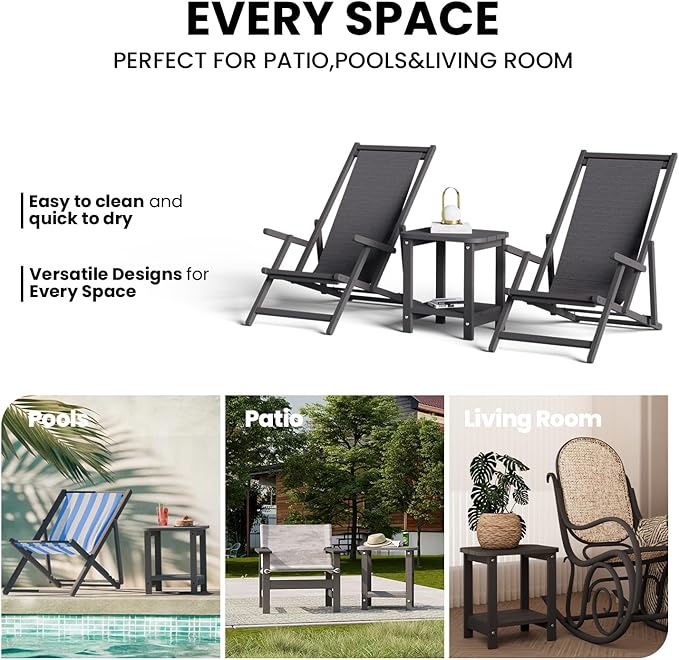 - 【HDPE Material】Outdoor side table is made from recycled HDPE, featuring a textured surface and wood grain. This material prevents warping, denting, rotting, and fading, effectively addressing the issues of solid wood.