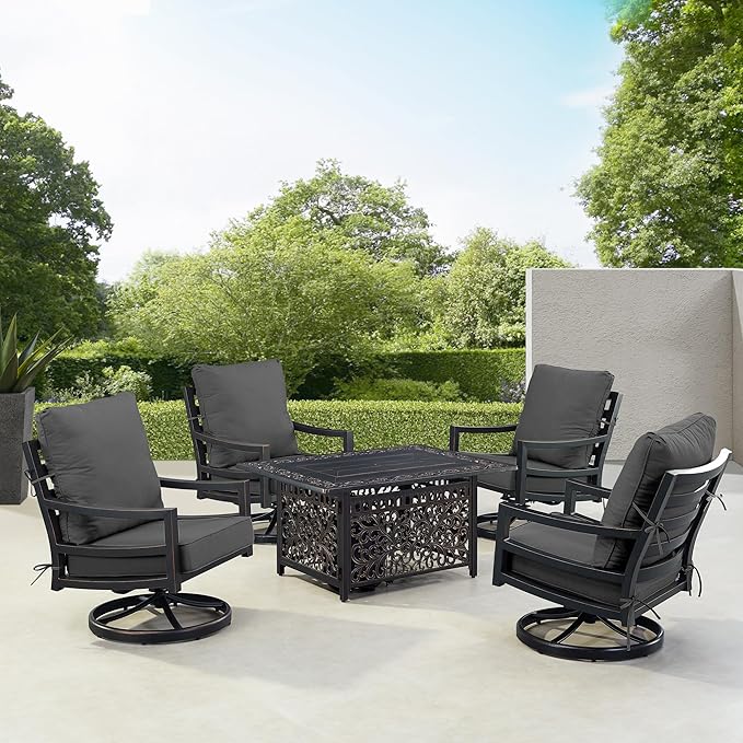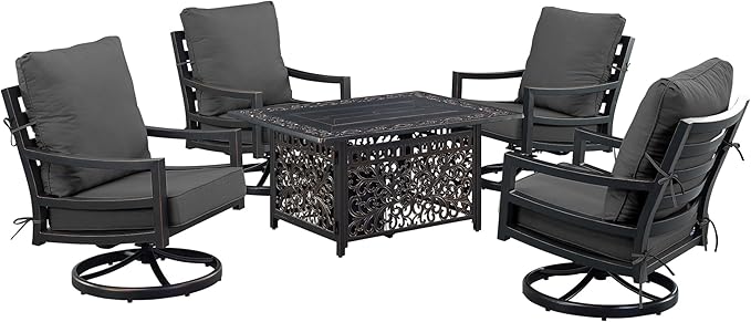 - This set comes with four swivel rocking chairs, quick drain cushions, glass wind blocker, clear fire glass, a table lid, propane cover and a protective fabric table cover
