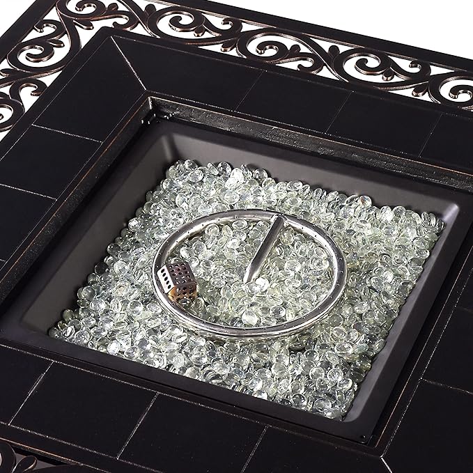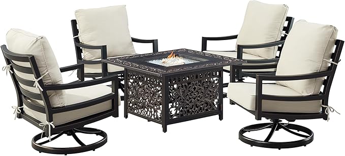 • This set comes with four swivel rocking chairs, quick drain cushions, glass wind blocker, clear fire glass, a table lid, propane cover and a protective fabric table cover