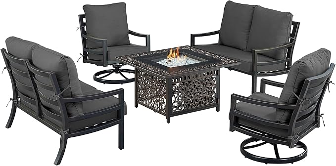 - This set comes with two loveseats, two swivel rocking chairs, quick drain cushions, glass wind blocker, clear fire glass, a table lid, propane cover and a protective fabric table cover