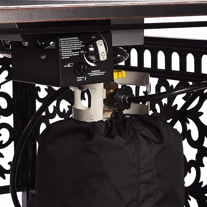 - This set comes with four swivel rocking chairs, quick drain cushions, glass wind blocker, clear fire glass, a table lid, propane cover and a protective fabric table cover