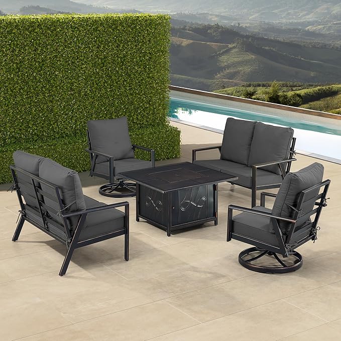 - This set comes with two loveseats, two swivel rocking chairs, quick drain cushions, glass wind blocker, clear fire glass, a table lid, propane cover and a protective fabric table cover