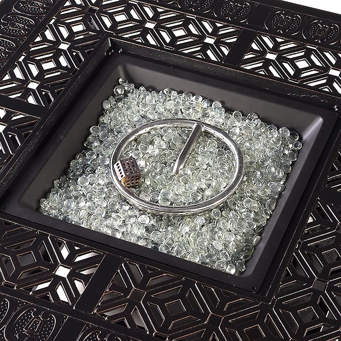 - This set comes with four swivel rocking chairs, quick drain cushions, glass wind blocker, clear fire glass, a table lid, propane cover and a protective fabric table cover