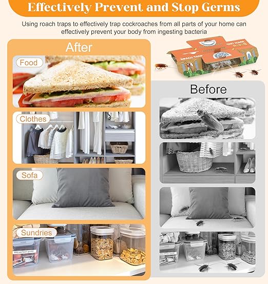 - [Strongly Adhesive Roach Glue Traps & Enhanced Bait] : Roach killer indoor infestation catches by placing scented cockroach baits (80% starch hydrolyzed and 15% soybean oil) or other food on the roach traps indoor to attract cockroaches as well as other vermin to crawl on the cardboard.