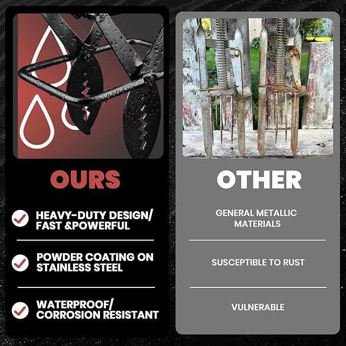 - PREMIUM BLACK STAINLESS STEEL CONSTRUCTION- Crafted from high-quality black stainless steel, our mole traps offer superior durability and corrosion resistance, ensuring long-lasting performance even in the toughest soil conditions