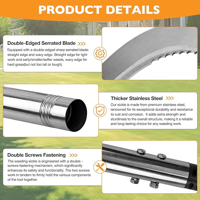- Premium Quality-Our weeder garden tool is crafted from premium stainless steel, renowned for its durability and resistance to rust. The blade is sharp and durable. Our weeding grass sickle is designed to assist you in effortlessly tackling yard grass cutting tasks.