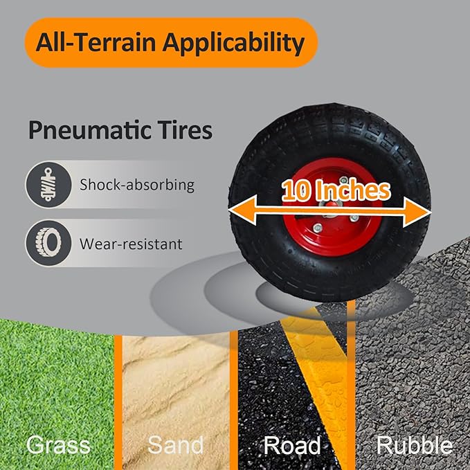 - All-Terrain Stability and Shock Absorption: Featuring four 10-inch inflatable wheels, the wagon offers exceptional stability and shock absorption across diverse terrains, making it perfect for outdoor adventures