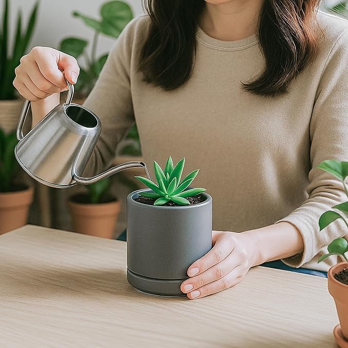 - Simple, elegant, and modern cylindrical straight round planter pot with saucer and drainage hole.