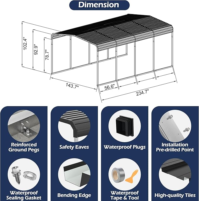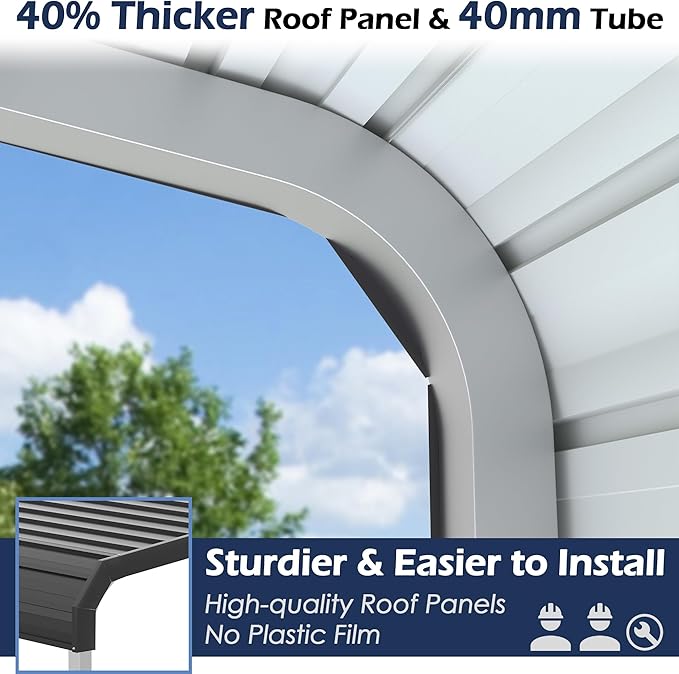 - 【More Upgraded Features】Safety eaves are installed at the front and rear of the carport, enhancing both aesthetics and roof safety. The carport base is reinforced with anchor bolts and thick steel plates, securely linking it to the ground. Waterproof plugs are fitted to the tubes frame to minimize ground water penetration