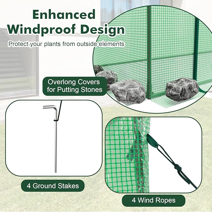 - 【Windproof design】 The green house features 4 wind ropes, 4 ground stakes, and overlong covers to ensure stability during strong winds and prevent movement. Stones can be added for further stability and plant protection.