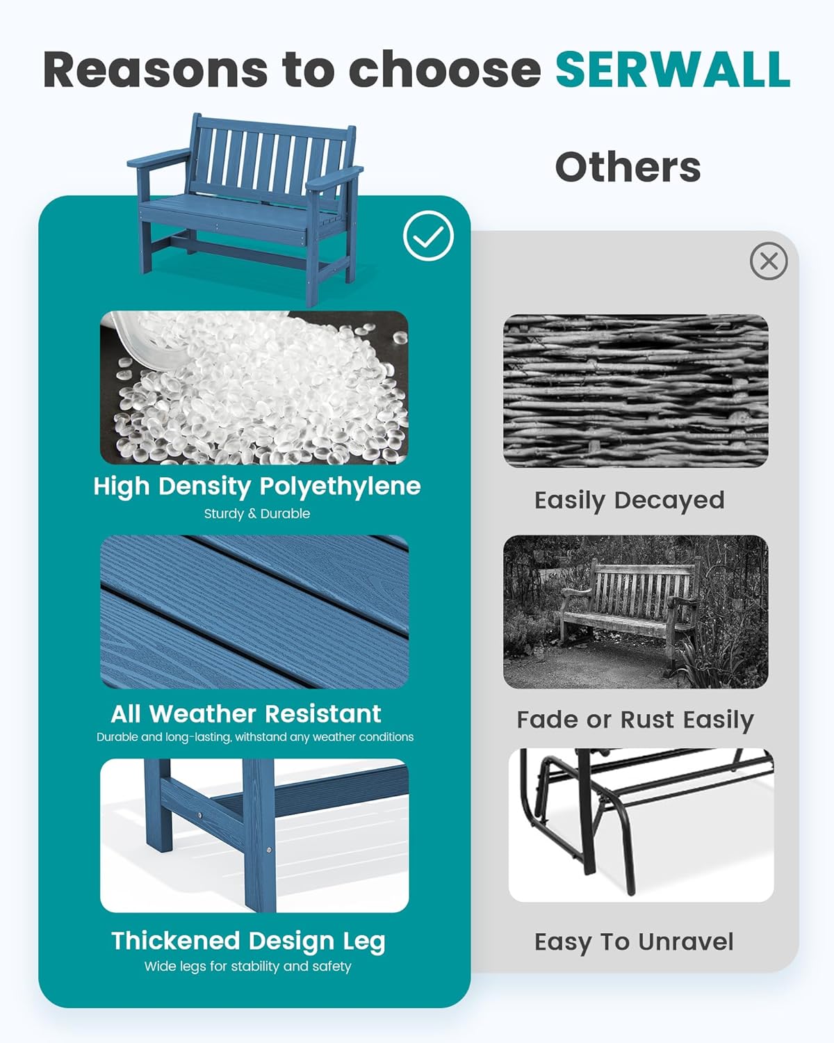- All-Weather Resistant: The SERWALL garden bench is made of durable high-density polyethylene (HDPE), along with 304 stainless steel hardware, making it resistant to various weather conditions and ensuring long-lasting durability. It is an ideal choice for any outdoor environment.