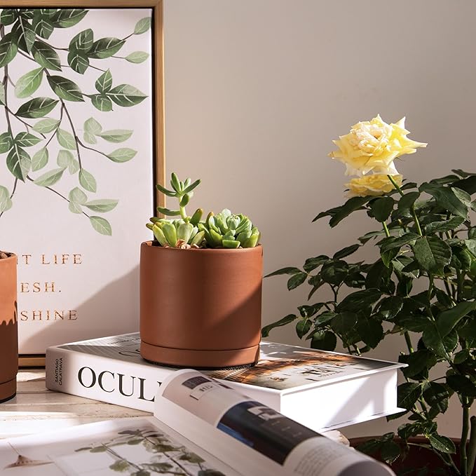 D'vine Dev 4 Inch Rust Terracotta Plant Pot with Drainage Hole and Saucer, Round Cylinder Planter Pot for Indoor Plants, Set of 2, 40-V-A-2