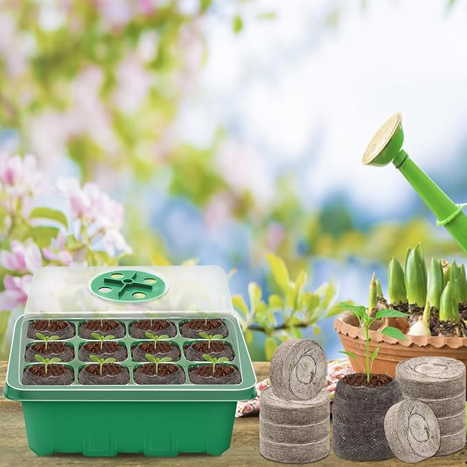 - 【Value Package】The kit contain 8 pcs green base trays, 8 pcs seed trays with 12 cells in each, 8 pcs humidity lids with dome, and 100 pcs peat pellets, not need soil to fill the cells, help you keep clean and tidy when planting, and creates a moist and warm environment needed for seed germination.