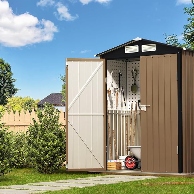 3X5FT Outdoor Steel Storage Shed with Lockable Doors, One Window,Ideal for Garden, Backyard, Patio Storage,Brown