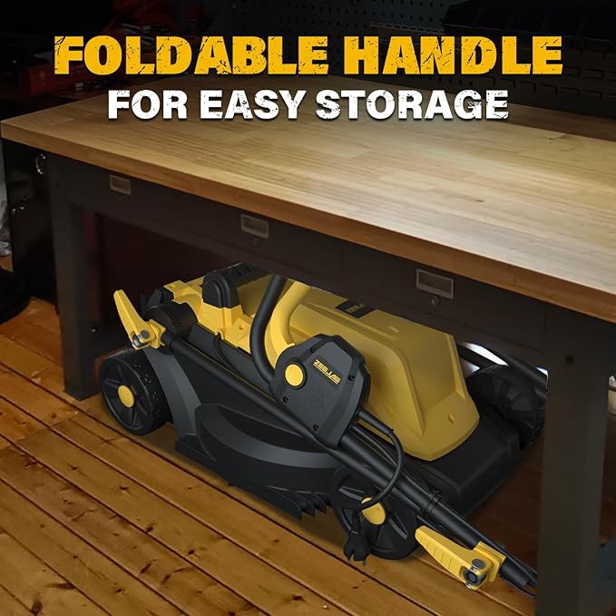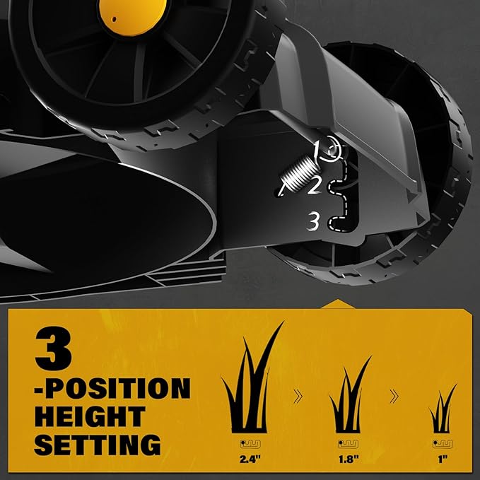 - CUSTOMIZABLE CUTTING HEIGHTS: This electric mower offers three adjustable cutting height settings, ranging from 1" to 2.4", to cater to various lawn care needs. And the handlebar folds down for easy storage, fitting seamlessly in tight spaces.