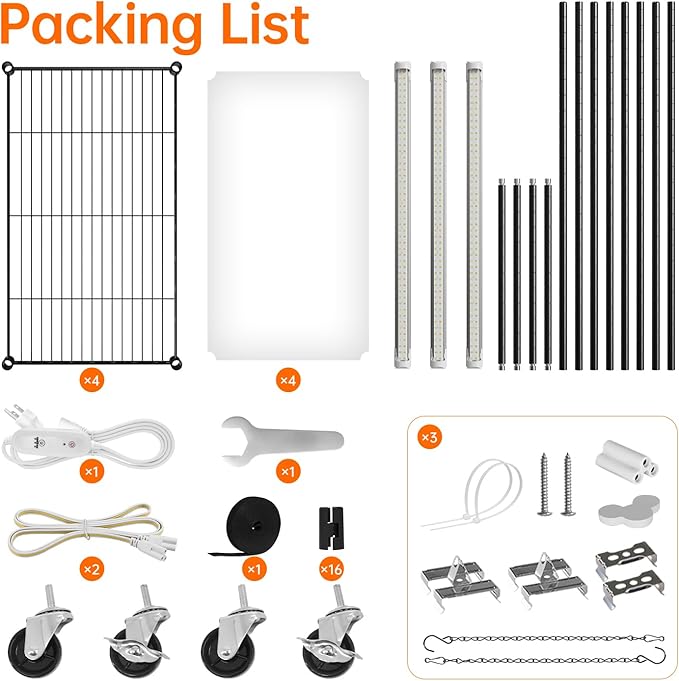 - Complete Package - includes 3 grow lights, 2 connecting cables (39.37 inches), 1 timer power cord (59 inches), 1 Storage Belt, 4 wire racks, 4 PP Mat, 4 industrial wheels, a grow light accessory kit, and a plant rack accessory kit.
