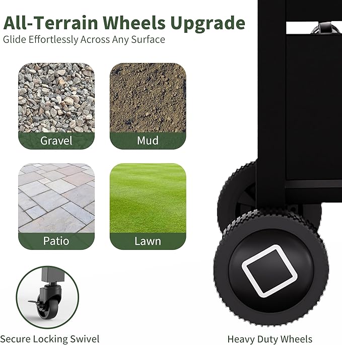- EFFICIENT GRILLING ORGANIZATION: The front panel turns into a condiment station, and foldable shelves provide extra space for plates and prep. Tool hooks keep your grilling tools close, streamlining your cooking process