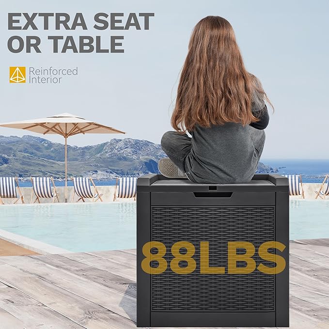 - Spacious Storage: Boasts a large capacity of 32 gallons and dimensions measuring 22" x 16.9" x 22"(LxWxH), this deck box provides ample room for organizing patio furniture cushions, gardening tools, outdoor supplies, and pool accessories
