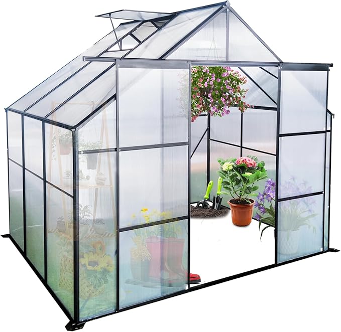 8X6 FT Greenhouses for Outdoors,Double Sliding Door Polycarbonate Greenhouse,Heavy Duty Walk-in Greenhouse, Drainage System & Galvanized Frame for Garden Backyard, Black