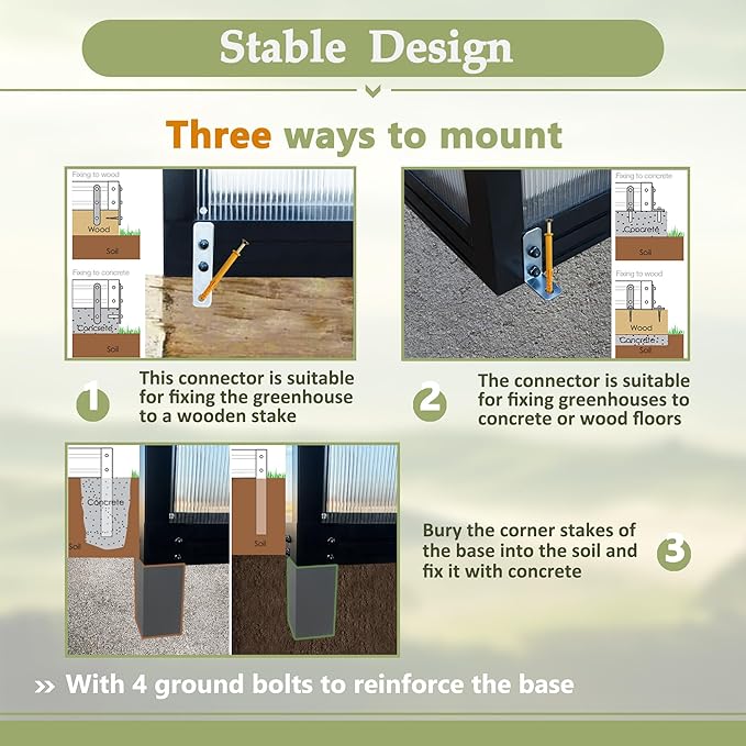 - Galvanized Base for Stability Constructed with a galvanized base, this greenhouse includes four ground bolts for added reinforcement. It secures the structure in the soil, offering protection against harsh weather conditions. Perfect for those looking for reliable greenhouses for outdoors.